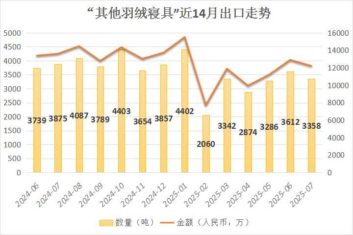 7月单月,我国约出口“其他羽绒寝具”3358吨,同比去年减少13%;出口金额约为1.22亿元人民币,比去年减少10%。