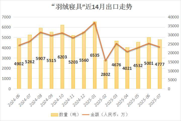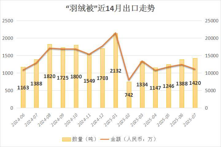 2025年1-7月,我国出口“羽绒寝具”约合32344吨,同比去年增长11%;出口金额约为17.02亿元人民币,同比增长10%。